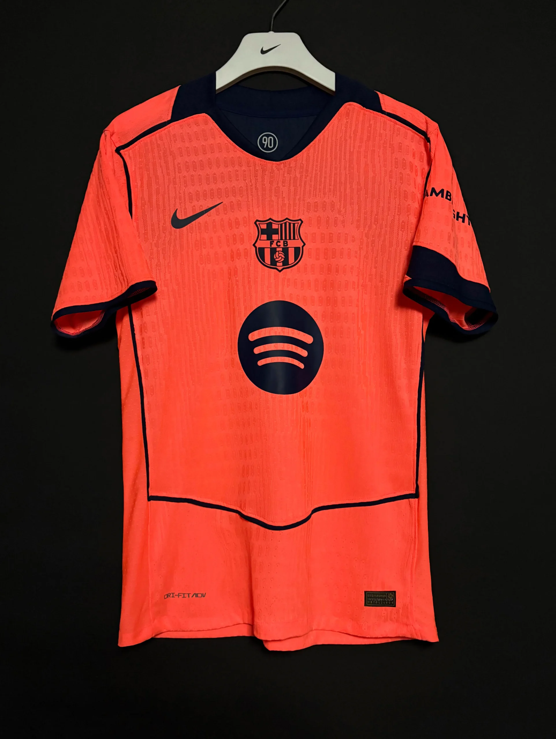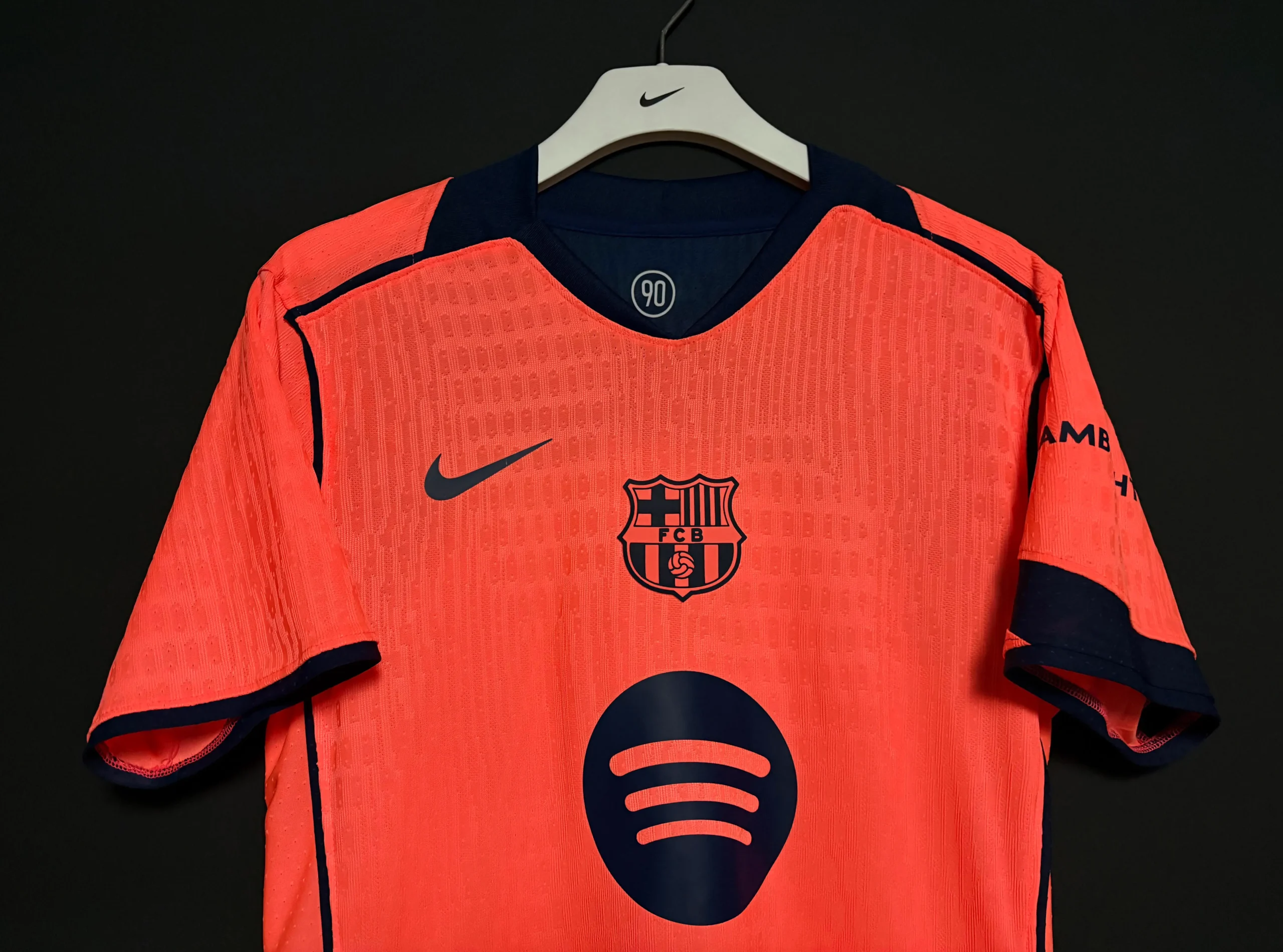 The FC Barcelona 2025-2026 Third Kit, designed by Nike, is a bold celebration of the club’s historic 2009 sextuple, inspired by the orange uniform worn during the Club World Cup final that capped an unforgettable year. The jersey features a striking bright mango orange base, officially dubbed “Bright Mango,” paired with dark navy (“Midnight Navy”) accents, including stripes on the collar and back, and geometric piping on the front. The design revives Nike’s iconic Total 90 template from the early 2000s, blending nostalgic flair with modern craftsmanship, and pays tribute to the revolutionary style of play that defined Barça’s golden era under Pep Guardiola.