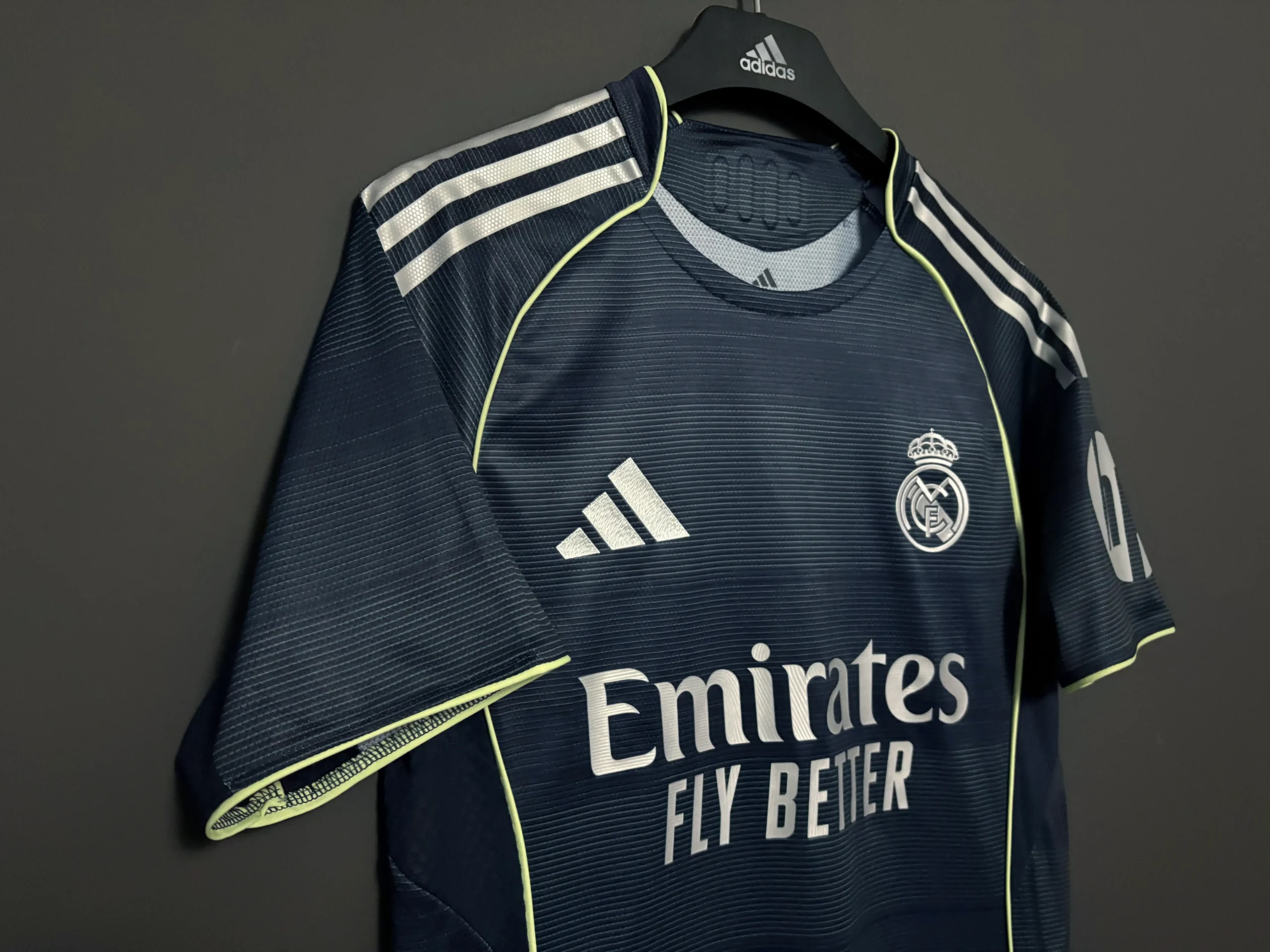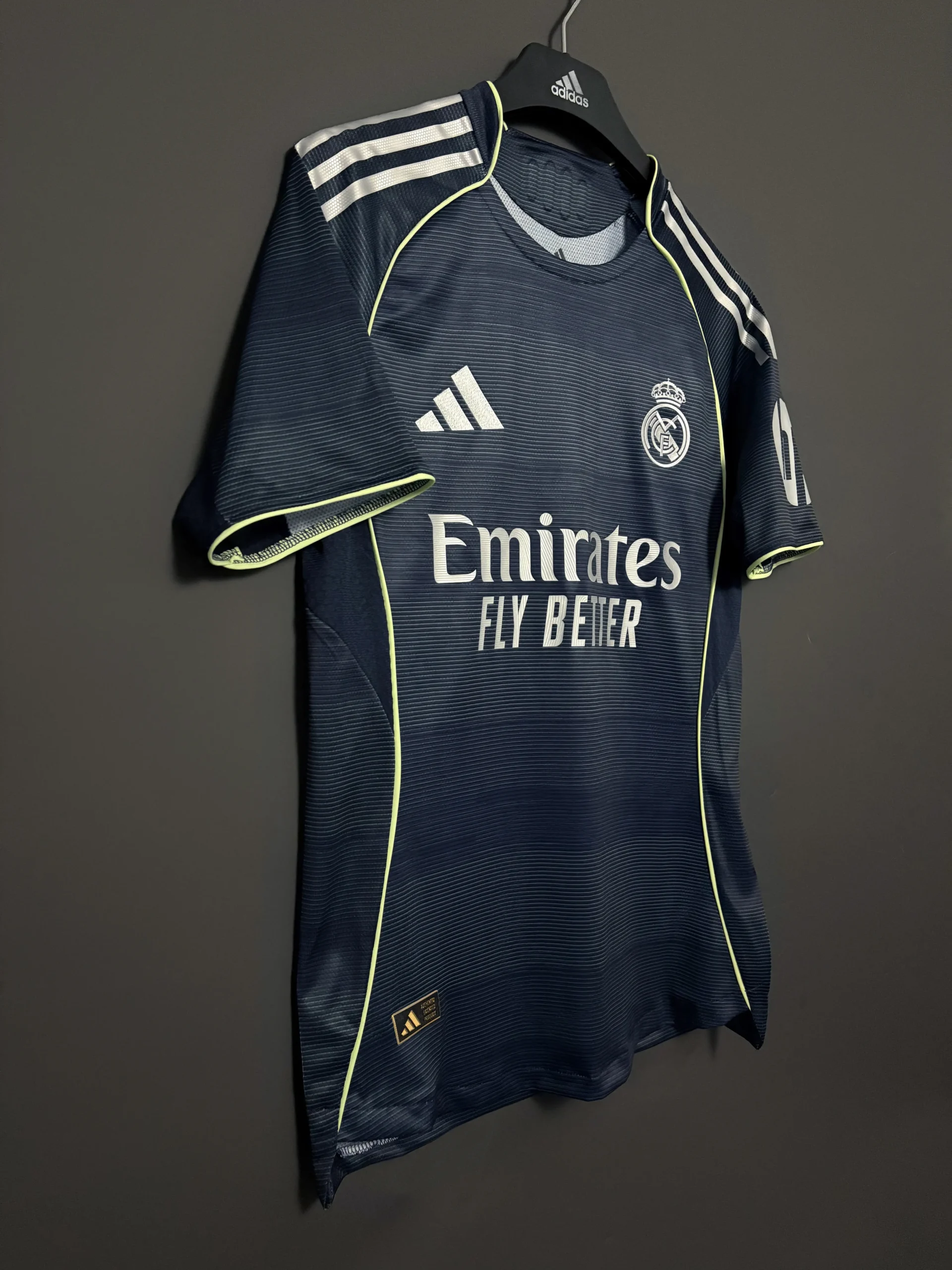 The Real Madrid 2025-2026 Away Kit, crafted by Adidas, draws inspiration from the magical nighttime atmosphere of the Santiago Bernabéu Stadium, capturing the allure of its illuminated facade. The jersey features a deep navy blue base, reminiscent of the 2012-13 away kit, with subtle line patterns that echo the stadium’s exterior design. Silver logos, including the Adidas emblem and Real Madrid crest, add a sleek, metallic sheen, while vibrant light-volt green trims on the collar and sides evoke the pitch under floodlights. The kit pays homage to the club’s storied nights with the phrase “90 minuti en el Bernabéu son molto longo” inscribed inside the collar, a nod to Juanito’s iconic 1985 quote.