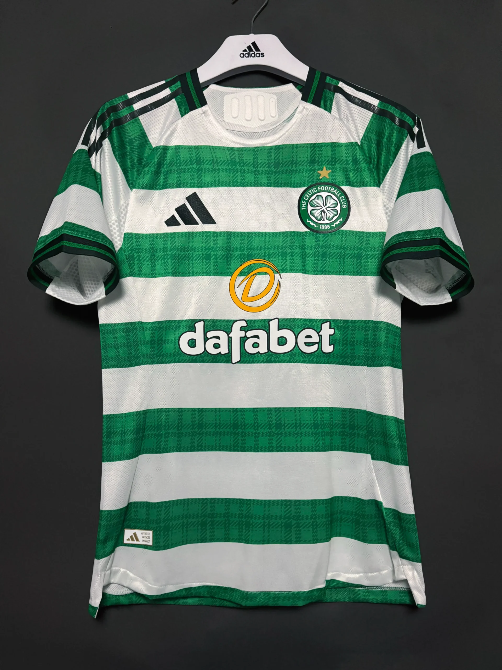 The Celtic 2025-2026 Home Kit, crafted by Adidas, is a vibrant celebration of the club’s Scottish and Irish heritage, blending tradition with a modern twist. The jersey features the classic green and white horizontal hoops, enhanced by a distinctive tartan pattern woven into the green sections, a first for Celtic’s home shirt. Black accents highlight the Adidas logo and three stripes on the shoulders, while the Celtic crest and Dafabet sponsor logo stand out in crisp white. The phrase “You’ll Never Walk Alone” is subtly inscribed inside the collar, honoring the club’s passionate fanbase. The kit is completed with white shorts and green-and-white hooped socks, creating a cohesive, iconic look.