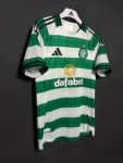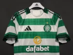 The Celtic 2025-2026 Home Kit, crafted by Adidas, is a vibrant celebration of the club’s Scottish and Irish heritage, blending tradition with a modern twist. The jersey features the classic green and white horizontal hoops, enhanced by a distinctive tartan pattern woven into the green sections, a first for Celtic’s home shirt. Black accents highlight the Adidas logo and three stripes on the shoulders, while the Celtic crest and Dafabet sponsor logo stand out in crisp white. The phrase “You’ll Never Walk Alone” is subtly inscribed inside the collar, honoring the club’s passionate fanbase. The kit is completed with white shorts and green-and-white hooped socks, creating a cohesive, iconic look.