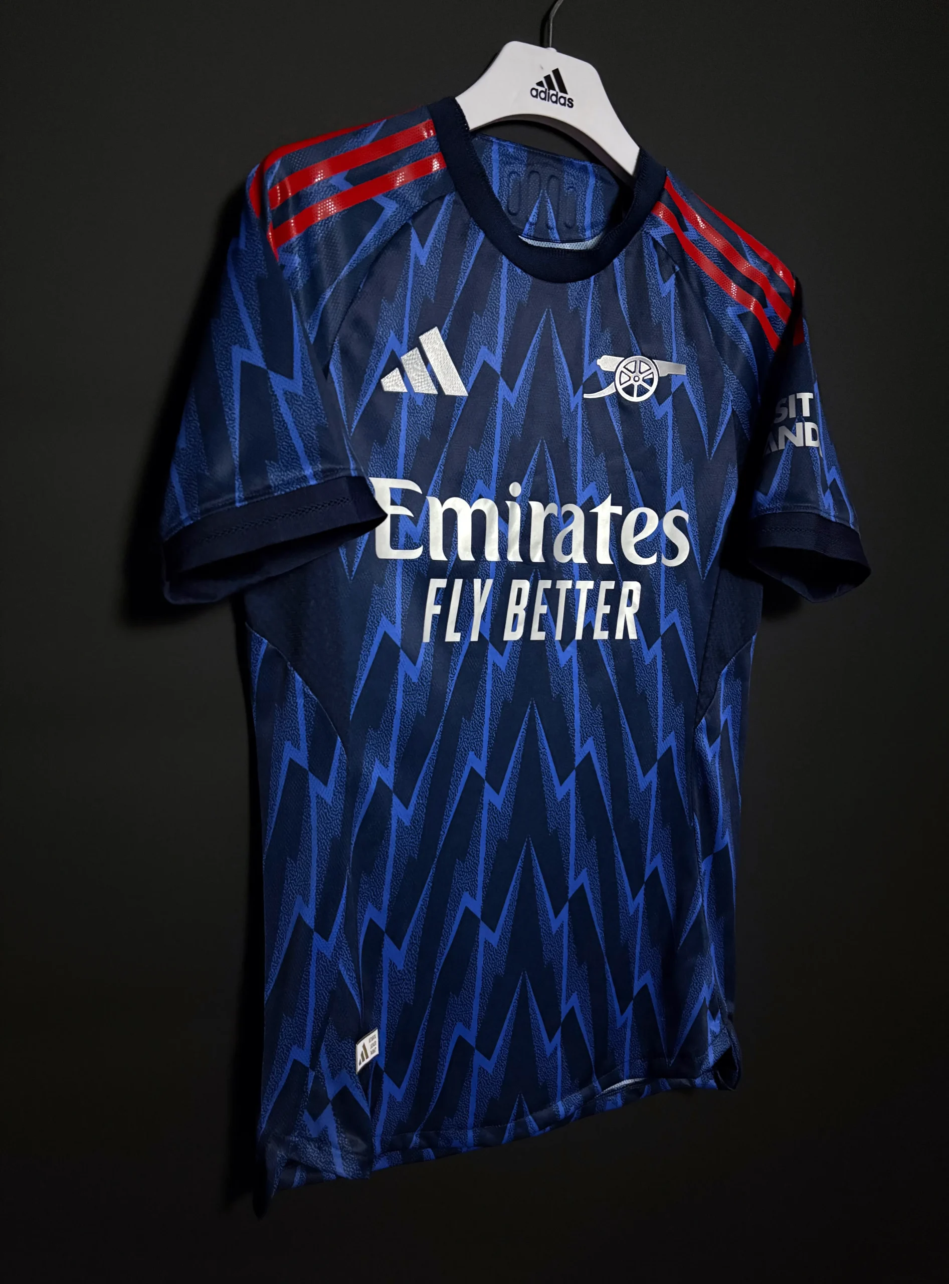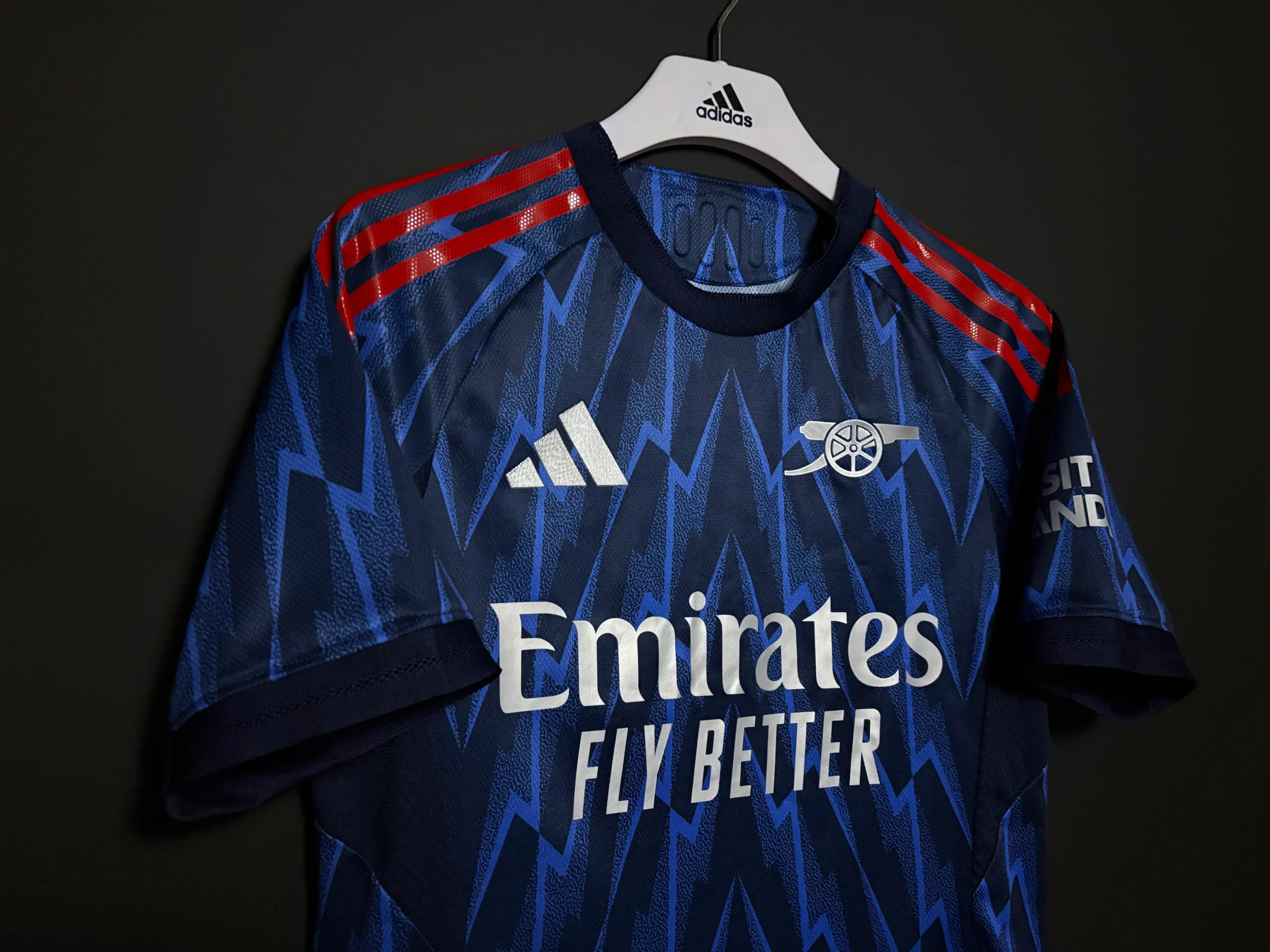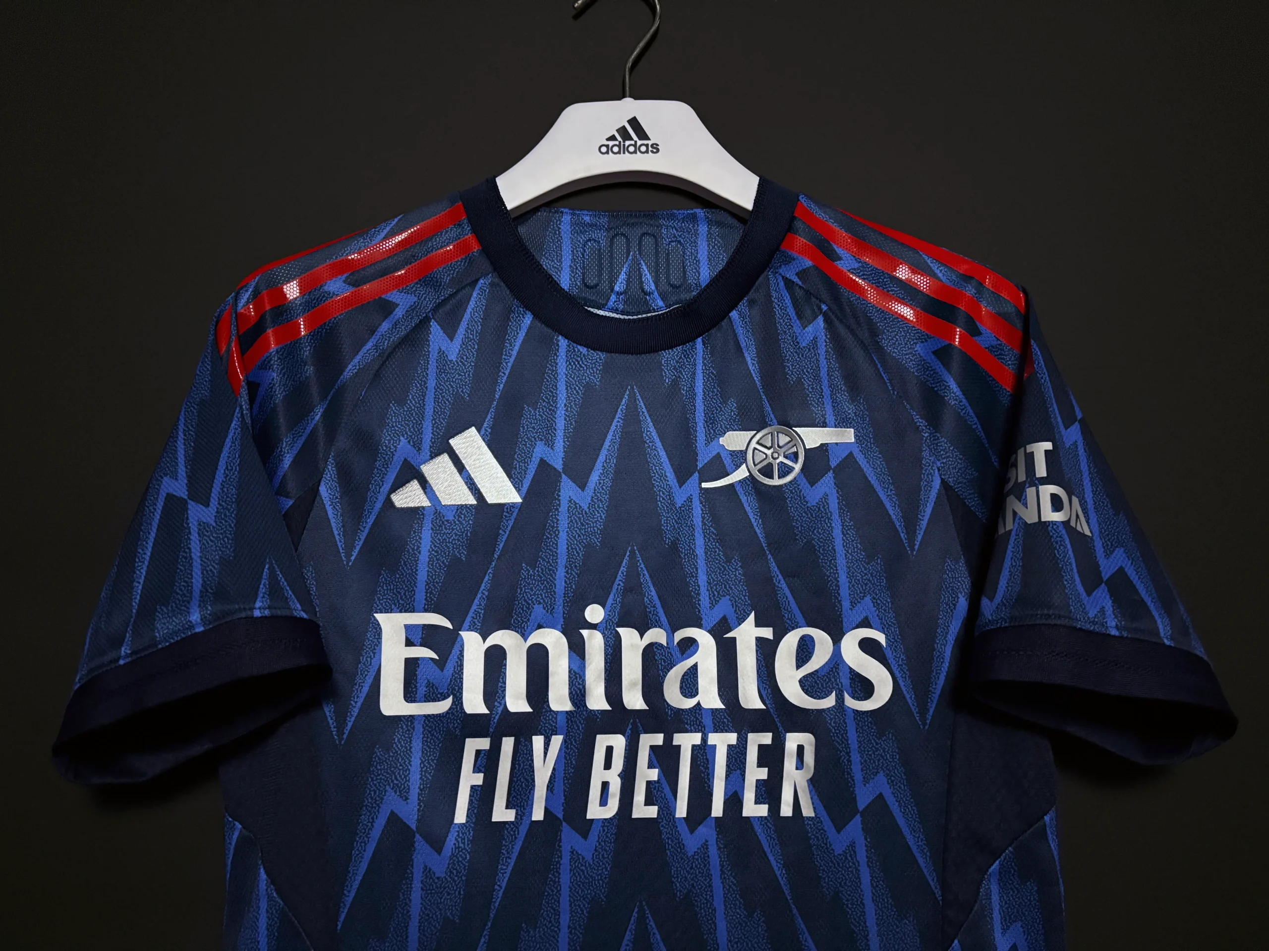 Discover the Arsenal 2025-2026 Away Kit by Adidas, a vibrant black jersey with bold red and gold accents, inspired by the 1998-99 away shirt. A nostalgic tribute for passionate Gunners fans.