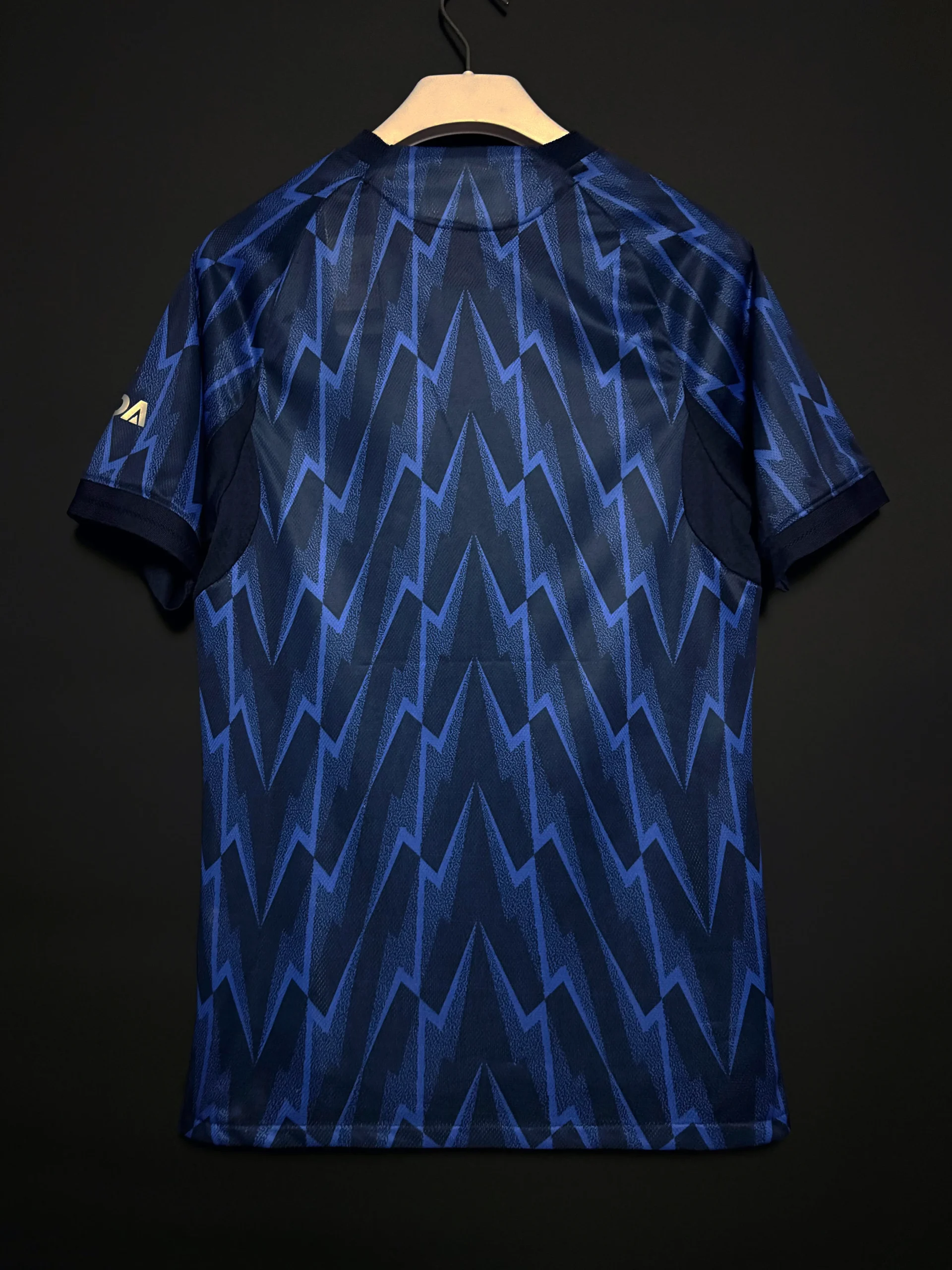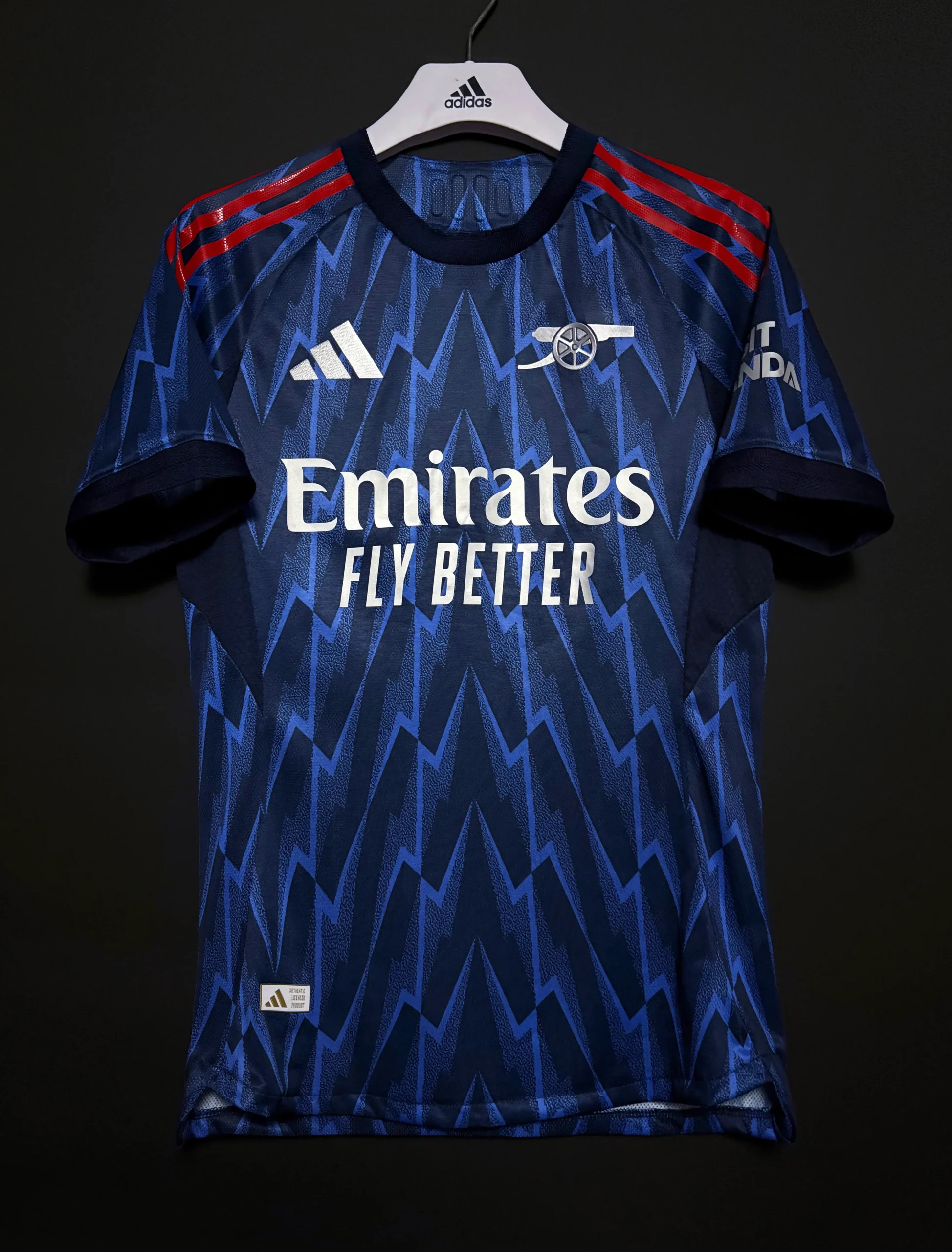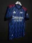 The Arsenal 2025-2026 Away Kit, crafted by Adidas, is a striking homage to the iconic 1998-99 away shirt, worn during the club’s memorable Premier League campaign under Arsène Wenger. The jersey features a sleek black base, contrasted by vibrant red sleeves and bold gold accents, including the Adidas logo, Emirates sponsor, and a gold cannon crest, echoing the simplified badge of the late 1990s. A subtle geometric pattern, inspired by the marble halls of Highbury, is woven into the black fabric, adding depth and a nod to the club’s historic home. The phrase “Forever Arsenal” is inscribed inside the collar, reinforcing the Gunners’ enduring legacy.
