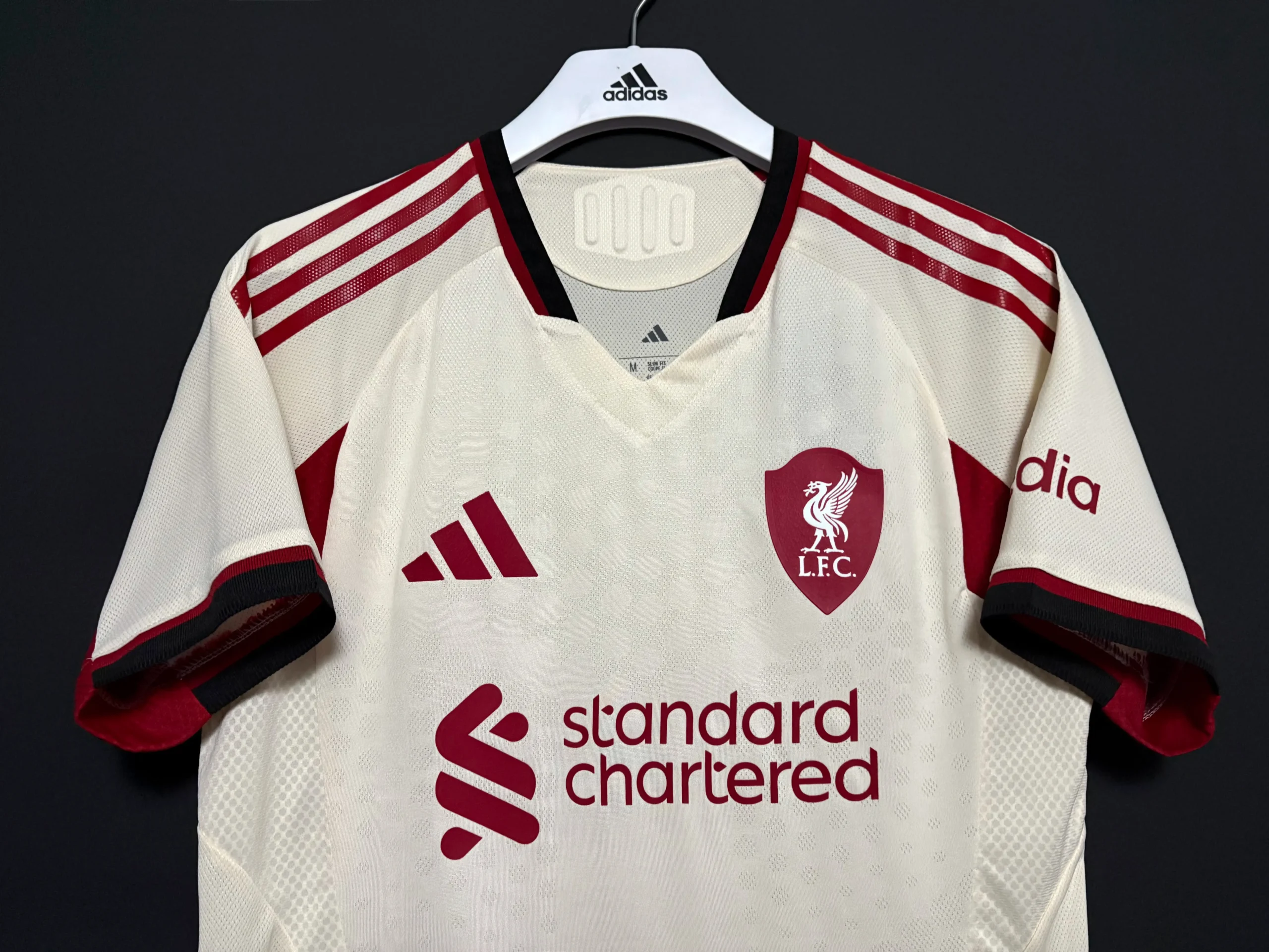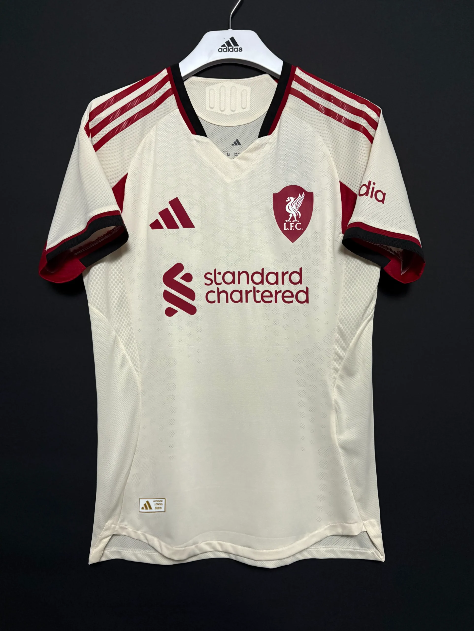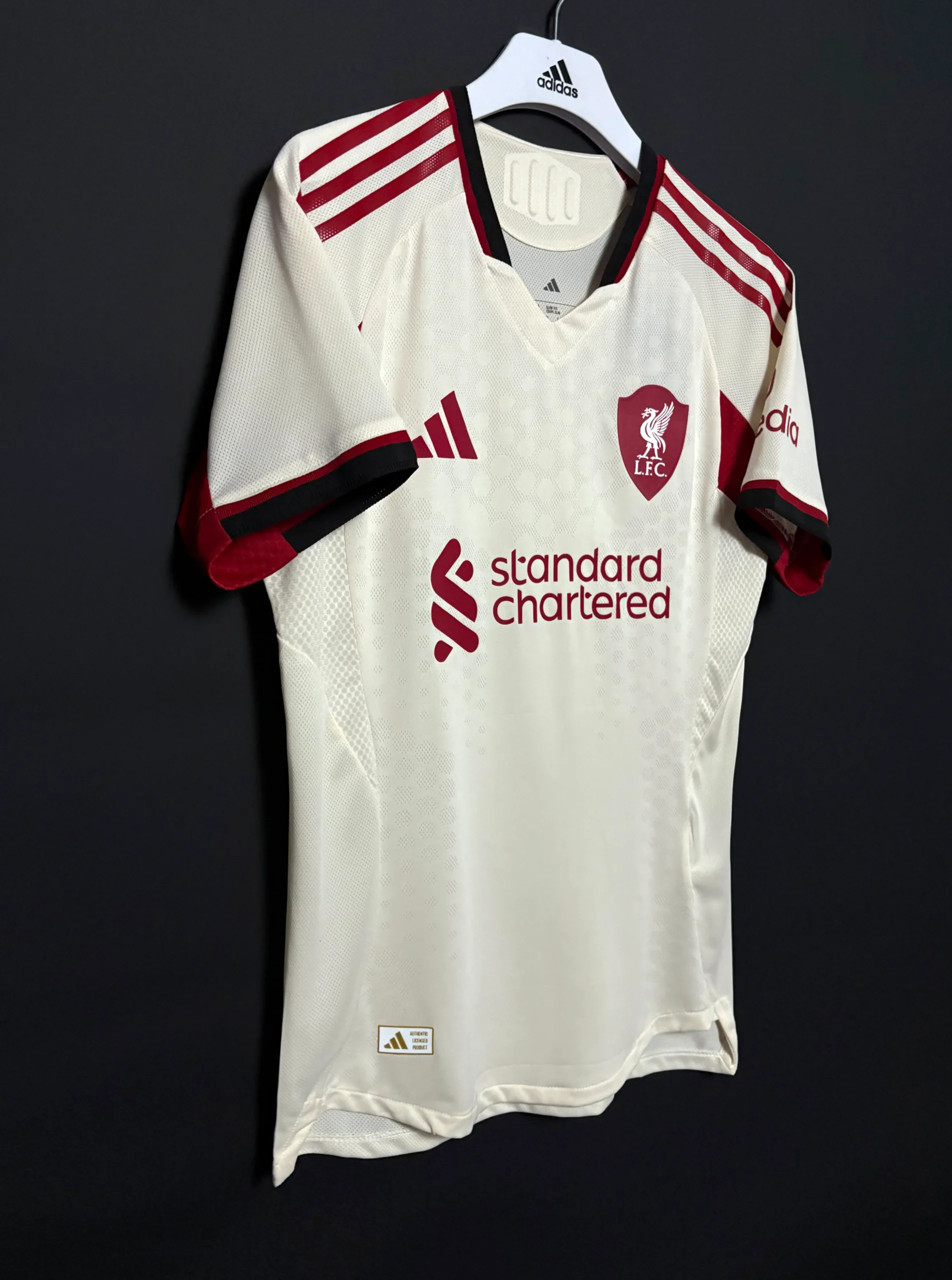 The Liverpool 2025-2026 Away Kit, crafted by Adidas, is a bold nod to the club’s iconic 1989-90 away shirt, worn during the last top-flight title win before the Premier League era. The jersey features a deep black base with anthracite grey panels on the shoulders and sides, creating a subtle, sophisticated contrast. Vibrant white logos, including the Adidas Trefoil, Liverpool crest, and Standard Chartered sponsor, stand out sharply, while a red trim on the collar and cuffs adds a touch of the club’s traditional color. A tonal, debossed pattern inspired by the Anfield Road Stand’s architecture runs across the front, blending heritage with modernity. The phrase “You’ll Never Walk Alone” is inscribed inside the collar, celebrating the Reds’ passionate fanbase.