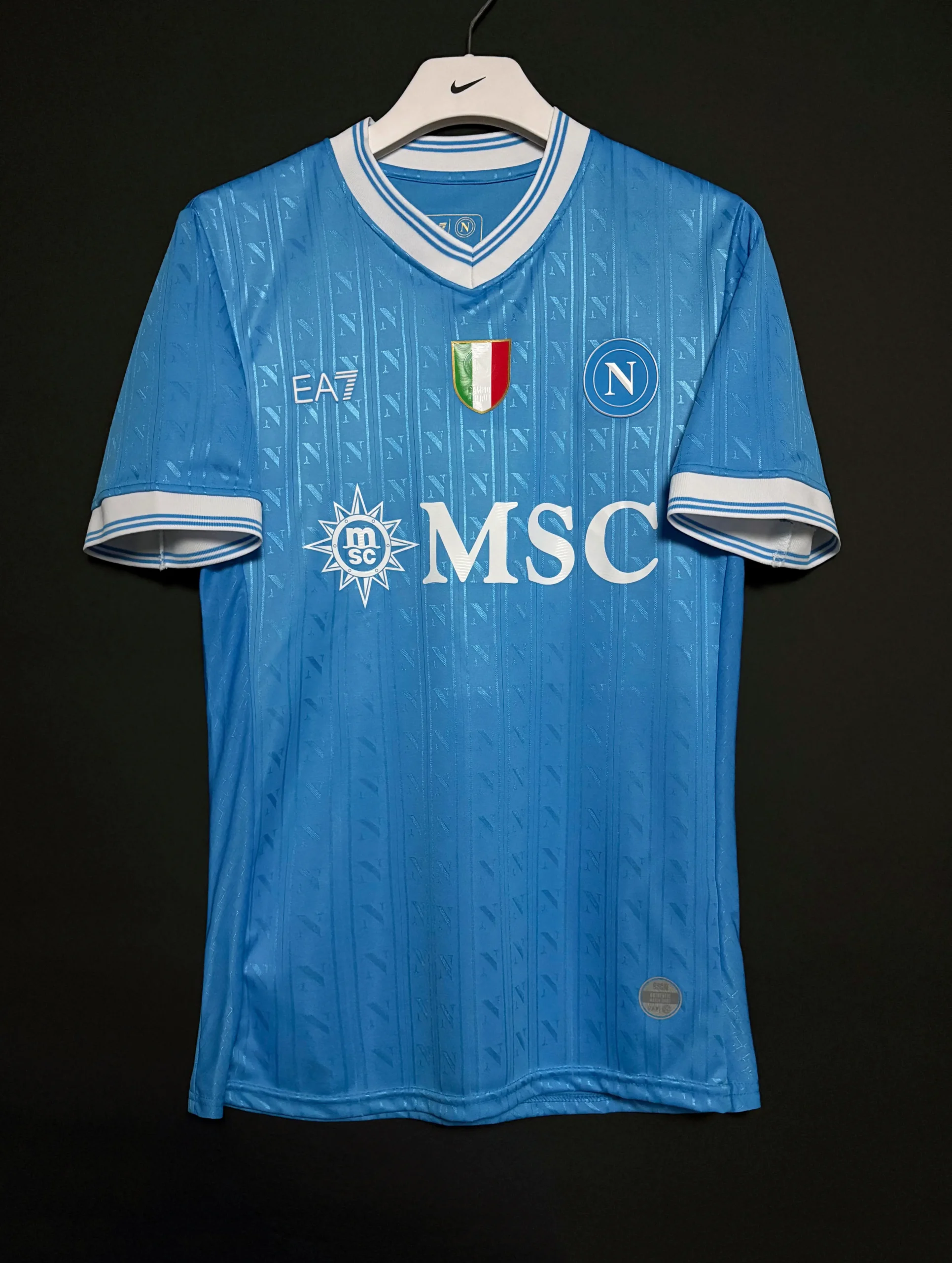 Explore the SSC Napoli 2025-2026 Home Kit by EA7, featuring a classic sky blue design with embossed Napoleonic “N” patterns and a central Scudetto. A blend of tradition, elegance, and championship pride for passionate Azzurri fans.