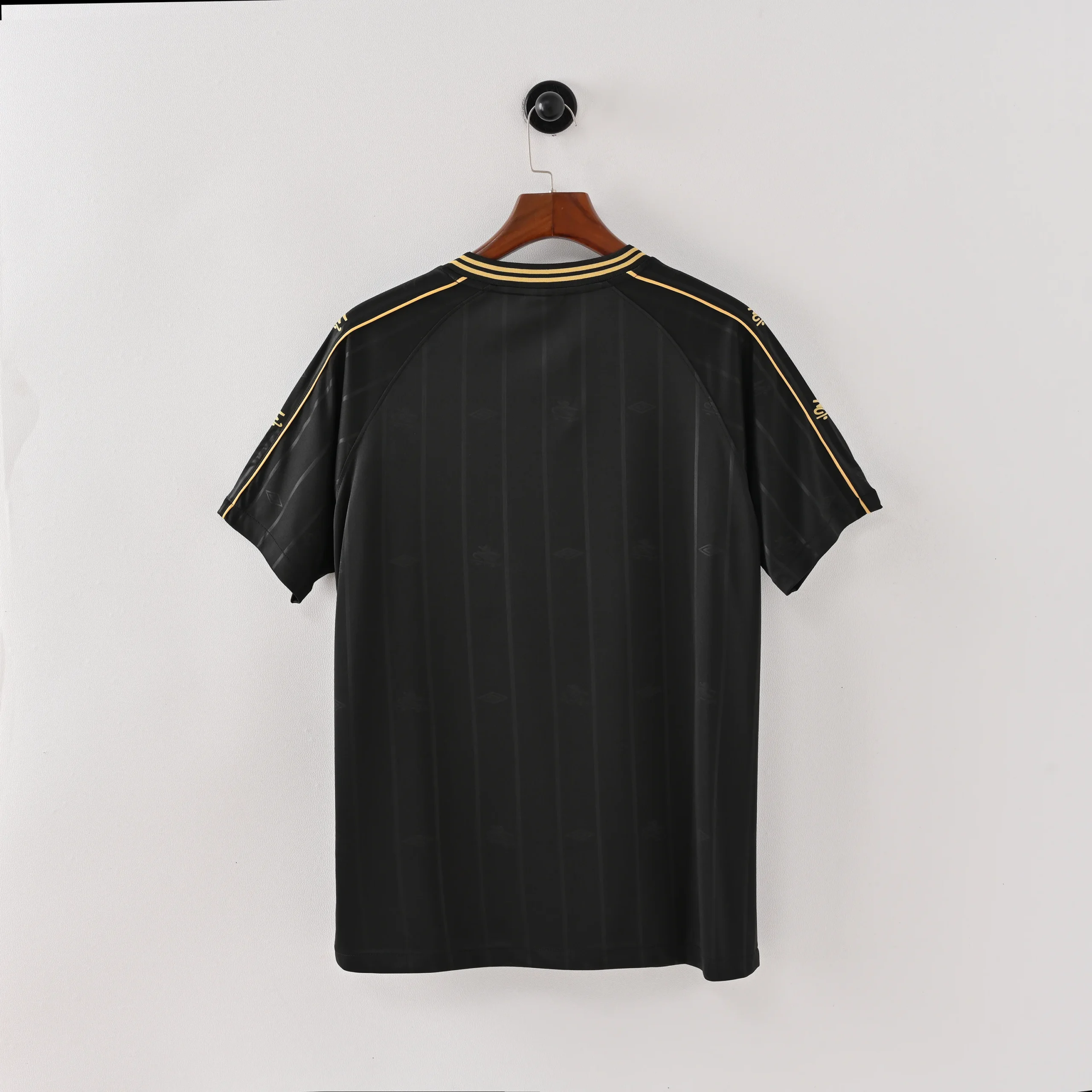 Paying tribute to the band, which originated in the coastal city of Santos, São Paulo, the Santos x Charlie Brown Jr. shirt from Umbro Brazil is limited to 1,992 jerseys to recognise the year that CBJR was formed. Presented in a sleek black pinstripe look, the shirt comes in an oversized fit and features a custom Jacquard fabric with gold branding and taping on the shoulders. The band’s name features across the centre of the jersey in grey with gold borders.