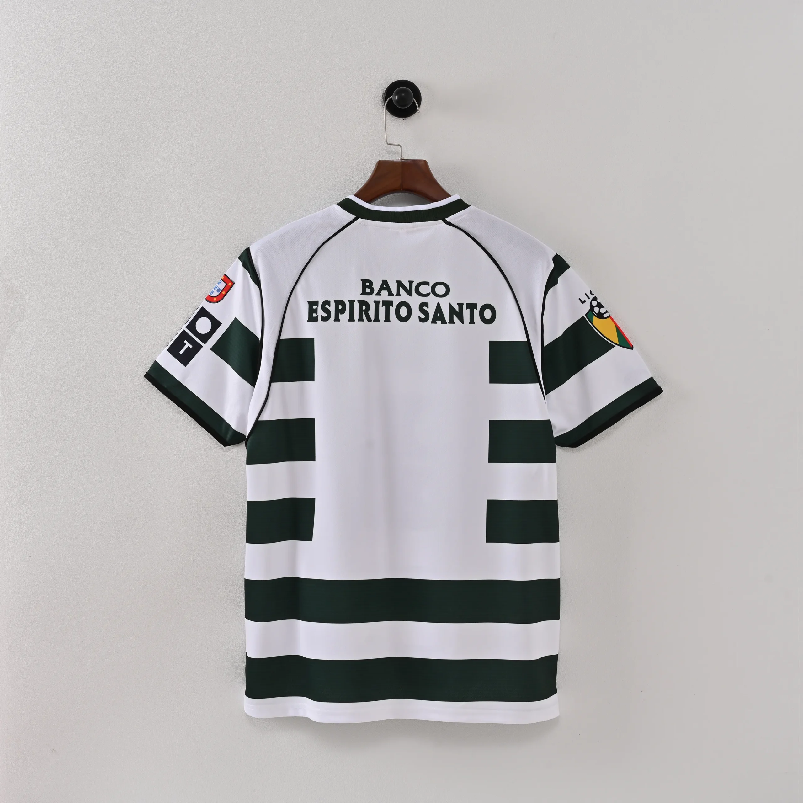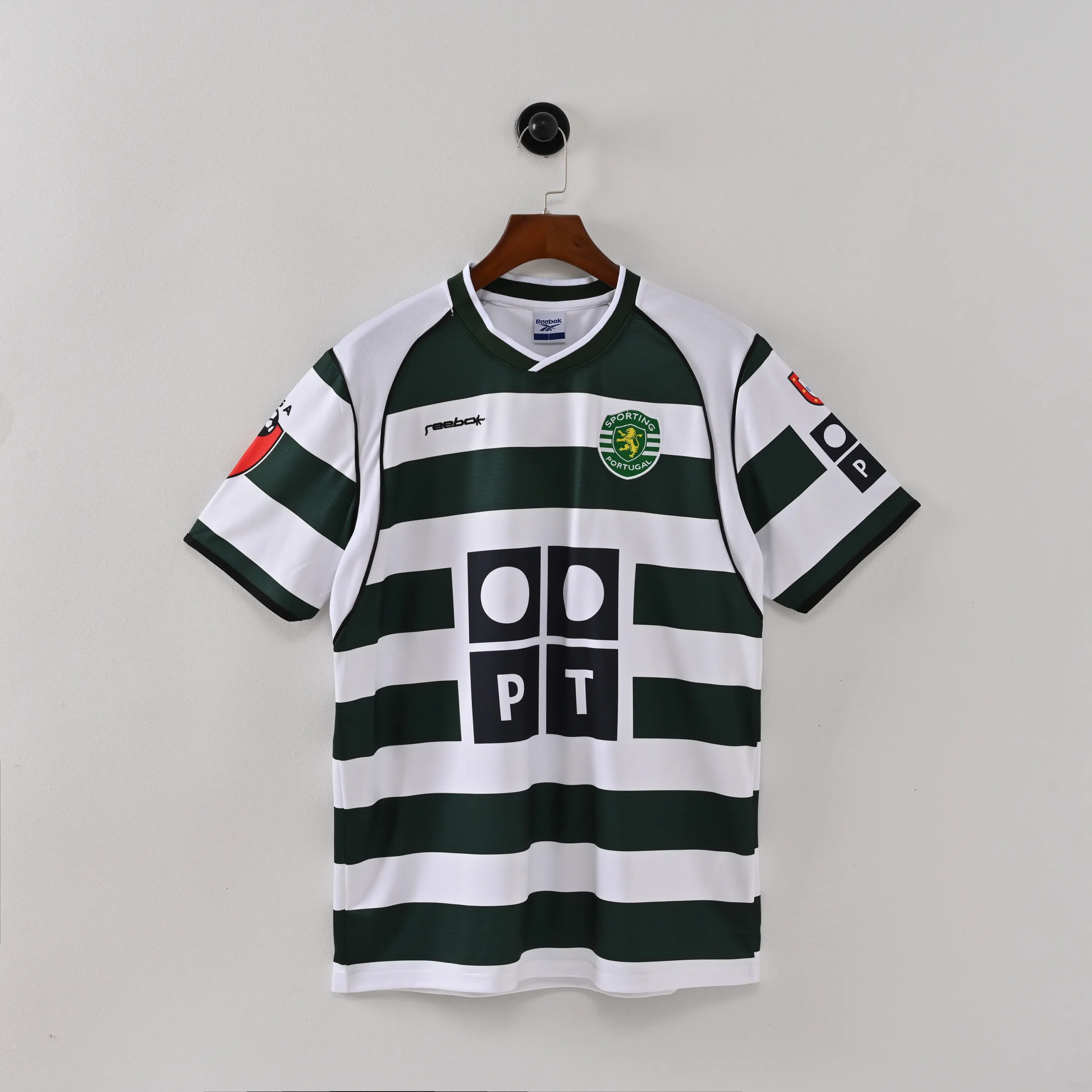 The Sporting Lisbon 2002-2003 Home Kit, crafted by Reebok, is an iconic piece of football history, famously worn during Cristiano Ronaldo’s debut season with the senior team at just 17 years old. The jersey features the club’s traditional green and white horizontal hoops, with a modern twist: each green hoop is composed of fine alternating green and black lines, creating a darker green effect from a distance. A stylized white panel connects the shoulders to the armpits, separated from the hoops by a thin black line, adding a contemporary edge. The black PT (Portugal Telecom) sponsor logo sits prominently in the center, with a secondary Banco Espírito Santo logo on the back. The kit is completed with white shorts and green-and-white hooped socks, maintaining a cohesive, classic look.